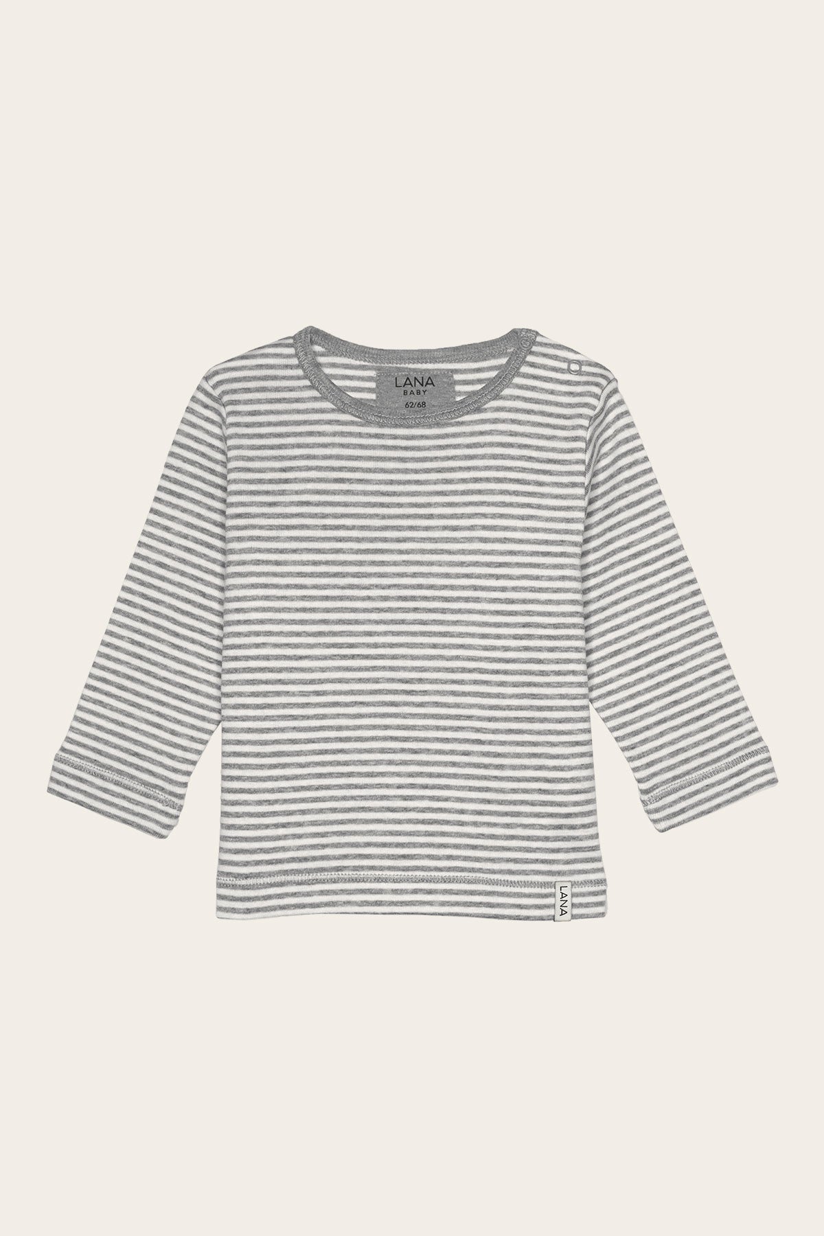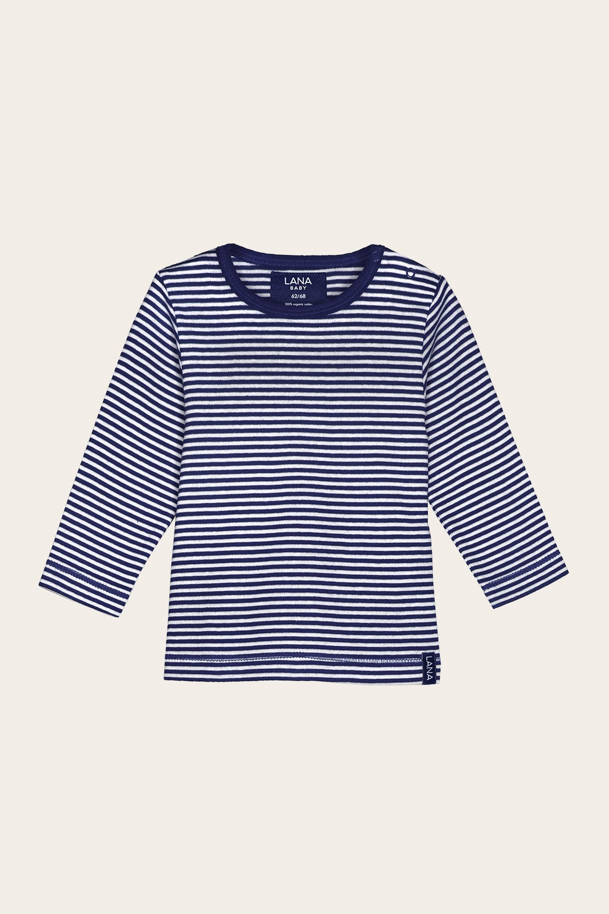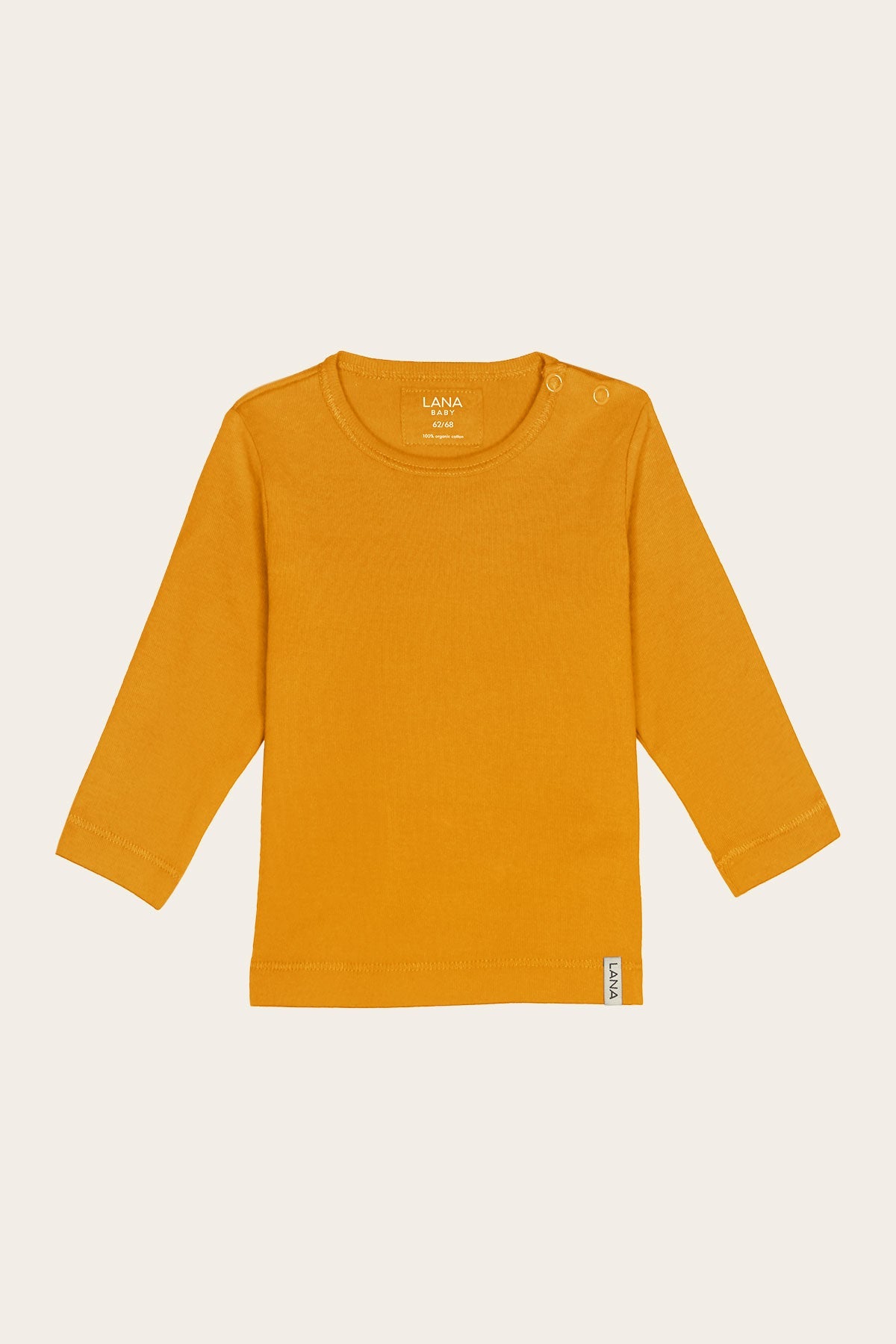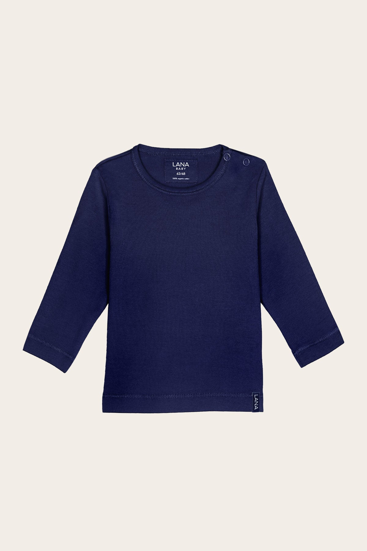 Funktionales einfarbiges Basic T-shirt mit Rundhalsausschnitt und langem Arm. An Babys linker Schulternaht befindet sich der Knopfverschluss mit zwei Druckknöpfen. Dadurch kann das Shirt schon den Kleinsten problemlos an- und ausgezogen werden. Das Shirt ist gerade geschnitten und die Säume wurden liebevoll umgeschlagen und abgesteppt.
