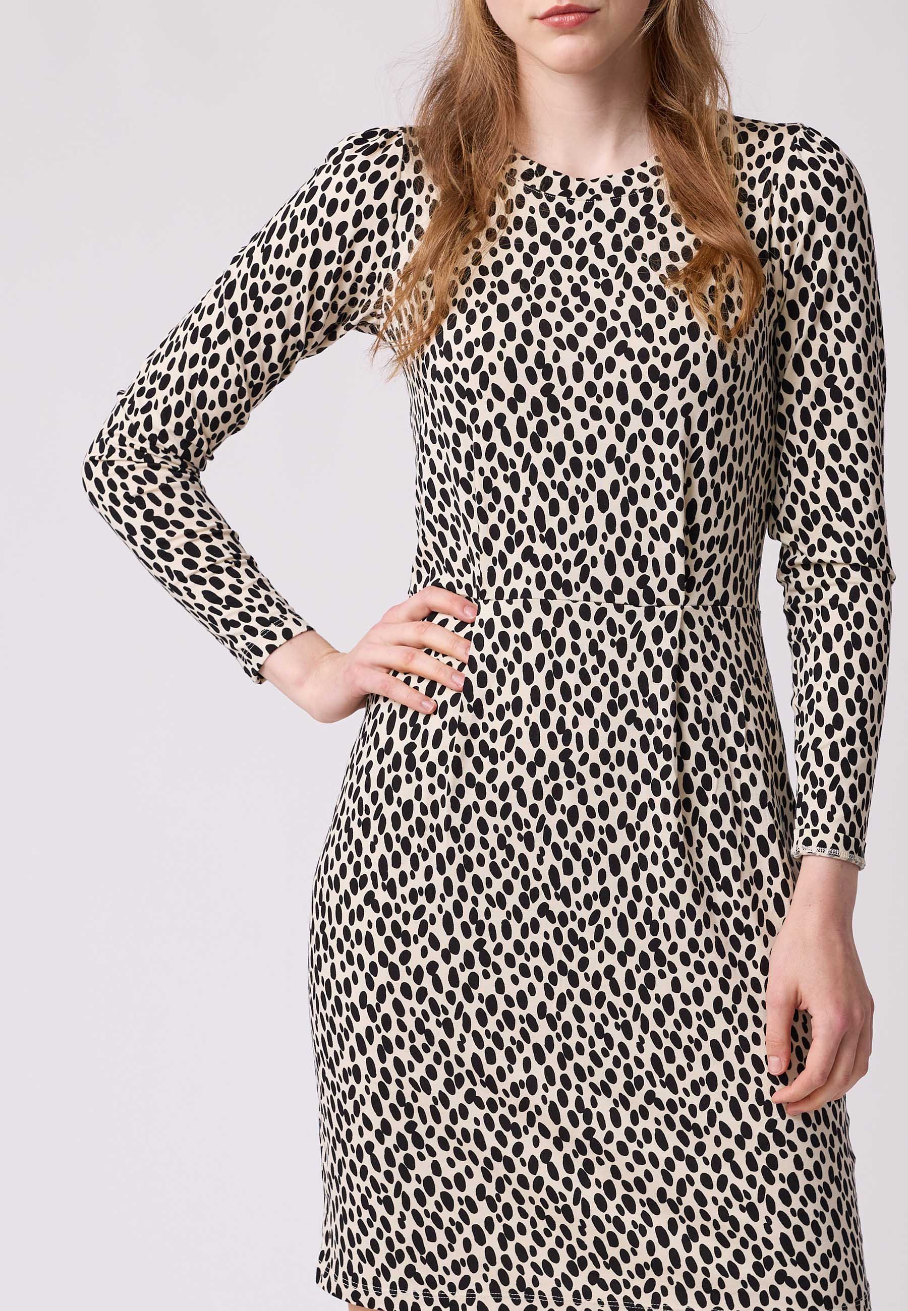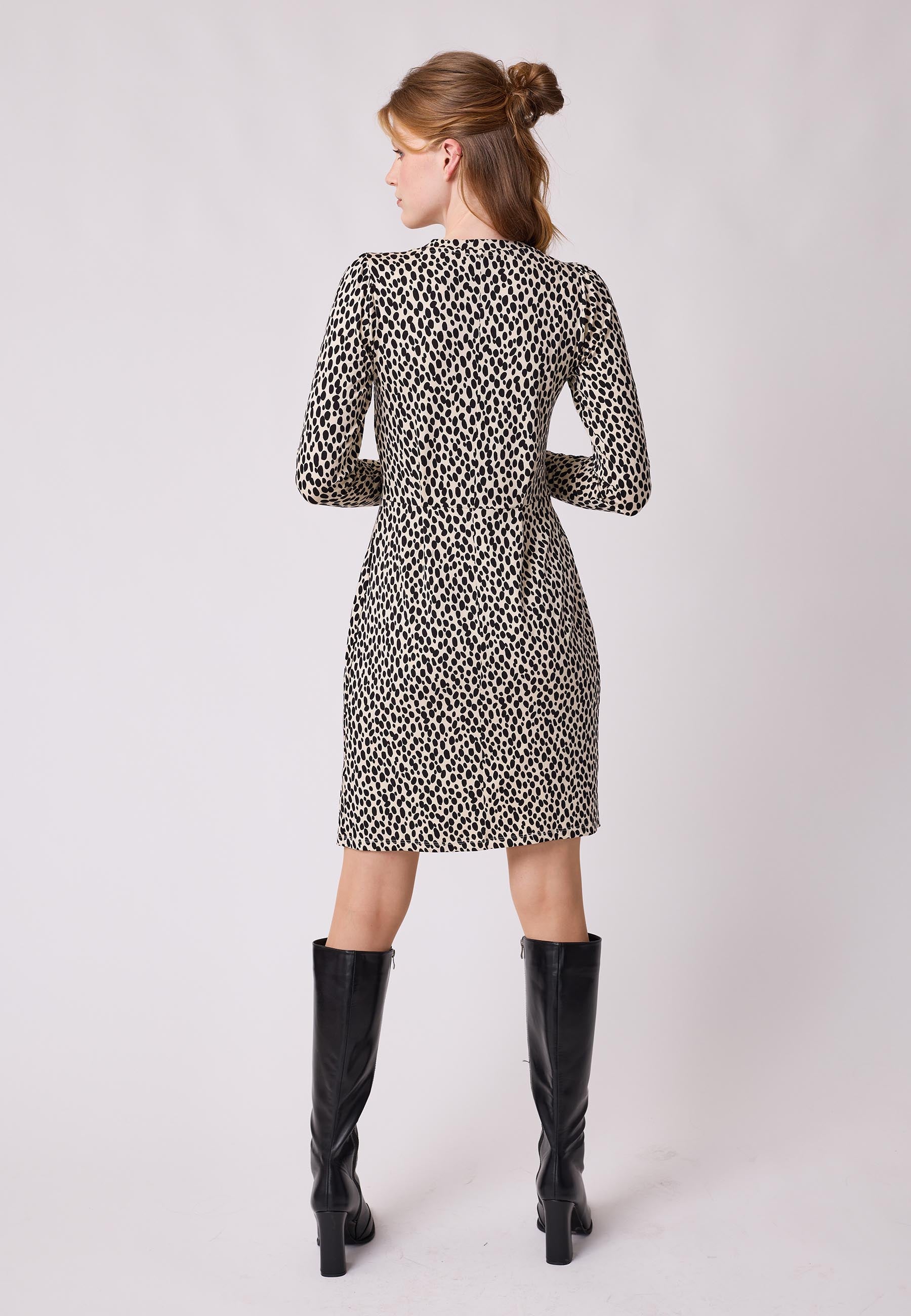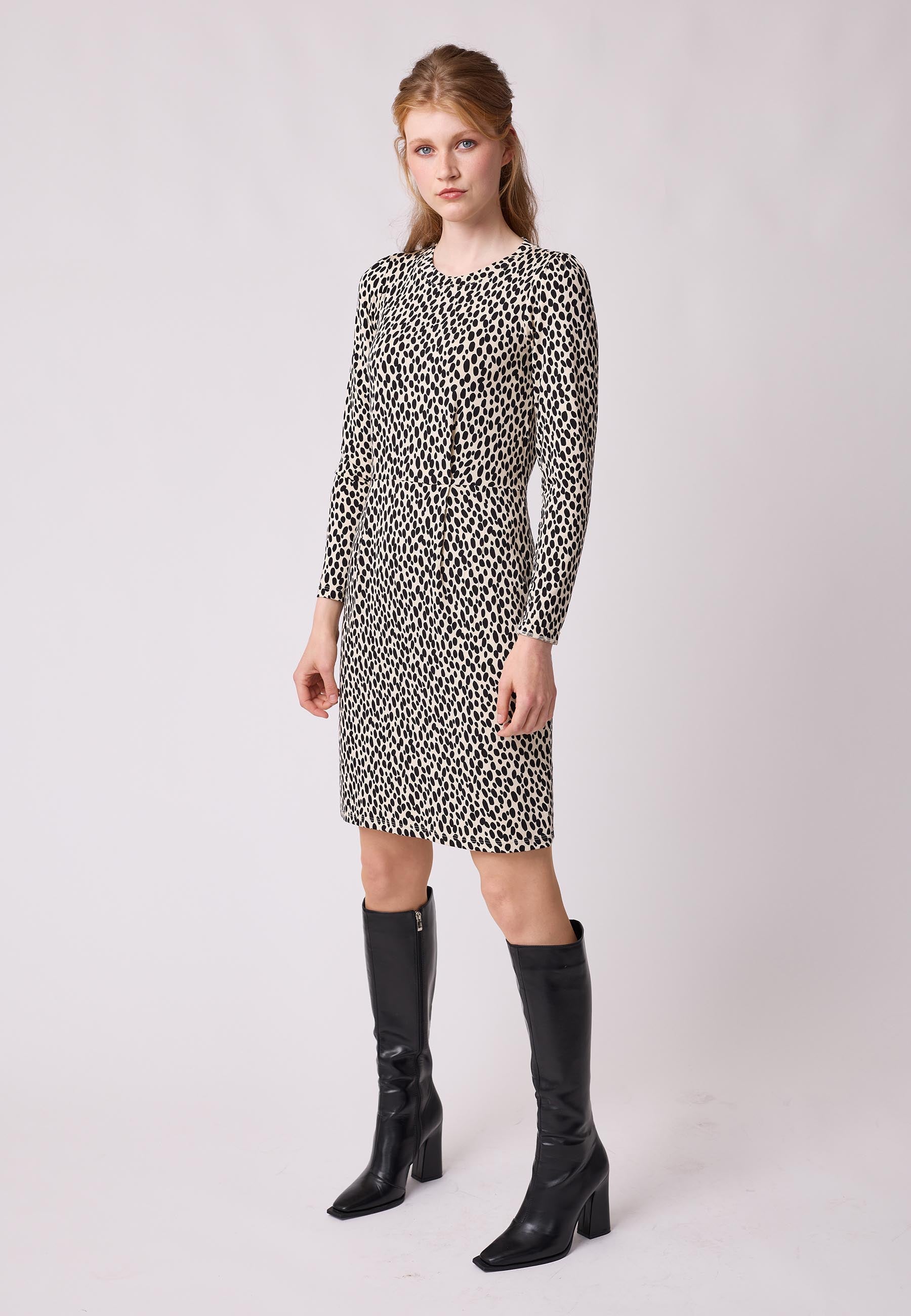 Notre robe Kornelia est une mini-robe moulante à col roulé plat. La taille est soulignée par une fine couture de séparation et des plis incrustés sur la jupe et le corsage. Cela crée le volume nécessaire tout en conservant l'avantage d'une taille marquée. L'épaule légèrement raccourcie est ornée d'une manche froncée. La robe tombe au-dessus du genou et possède une manche longue.