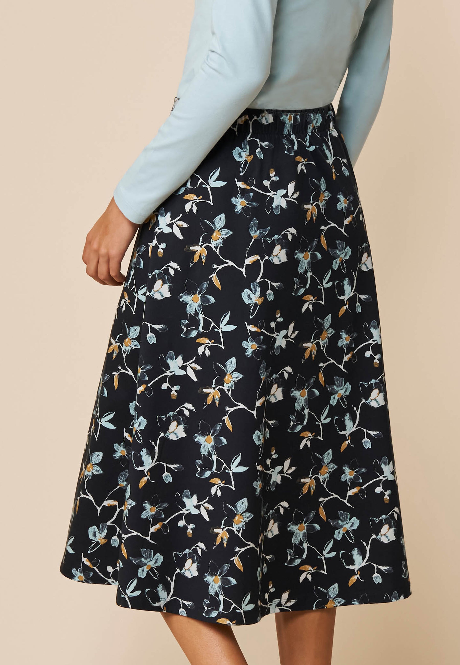 Ein knieumspielender Rock in A-Linie, der jede Bewegung mitmacht. Der breite, teilelastische Bund sorgt für eine gute und zugleich komfortable Passform. Ein Rock für viele Gelegenheiten!