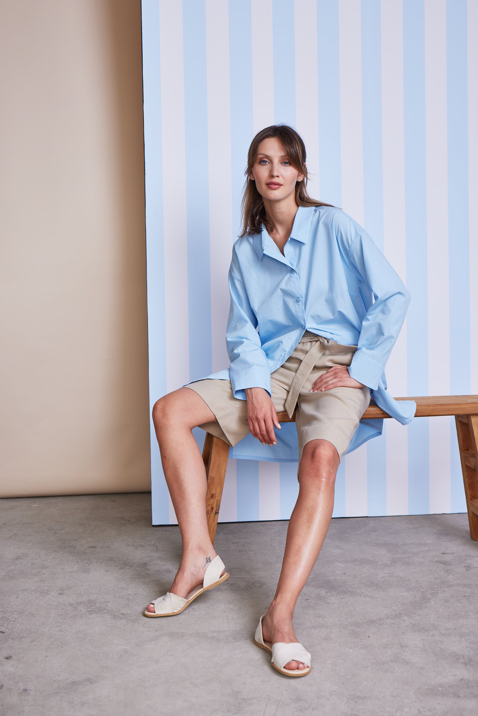Die Bluse Narcisa besteht aus 100 % zertifizierter Bio-Baumwolle (kbA, GOTS) und bietet ein angenehm weiches, atmungsaktives Tragegefühl, das perfekt für warme Tage oder geschichtete Sommer-Looks ist. Die klassische Hemdblusen-Form mit klaren Linien und feinen Details verleiht der Bluse eine feminine Eleganz bei gleichzeitig natürlichem Komfort.