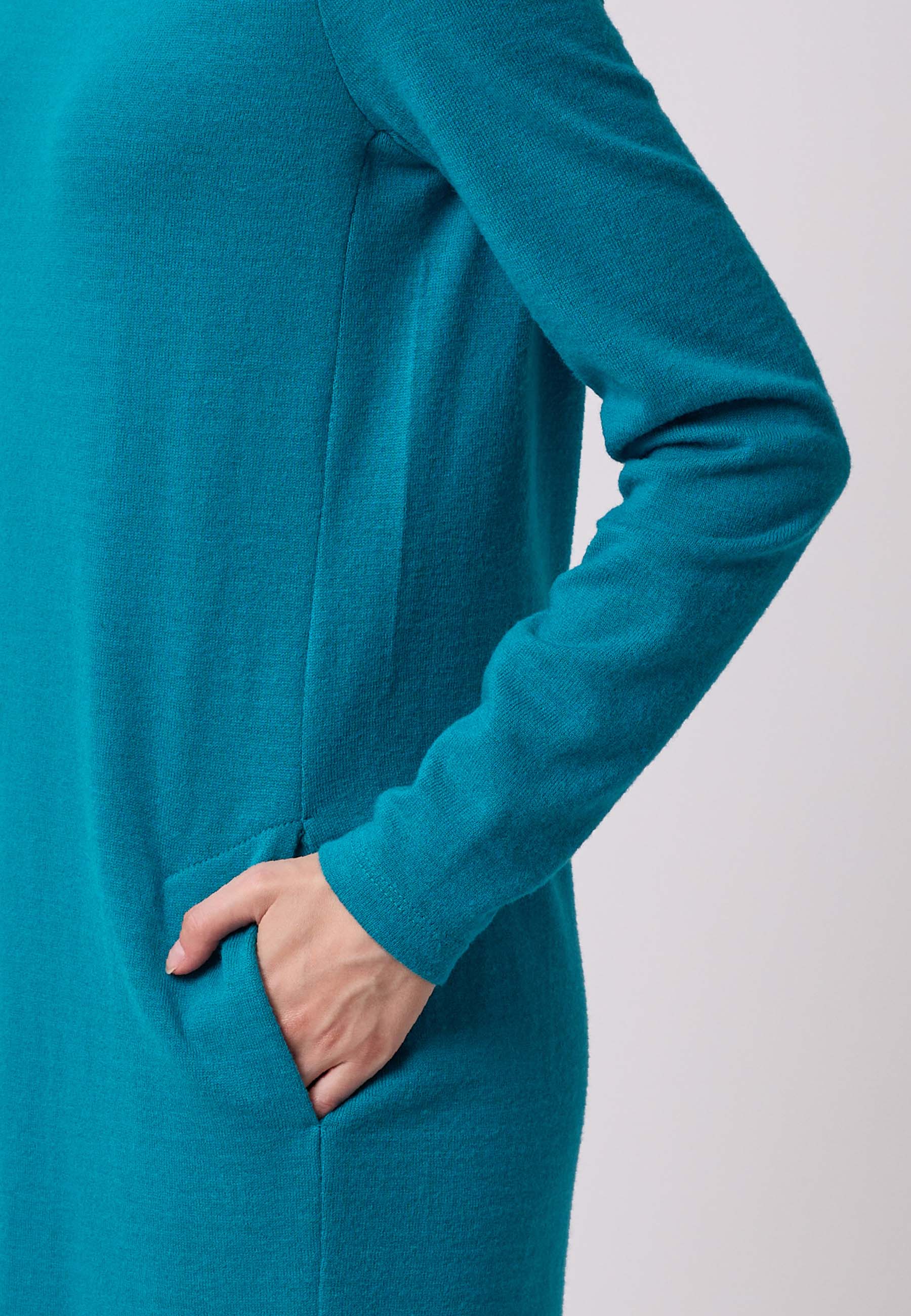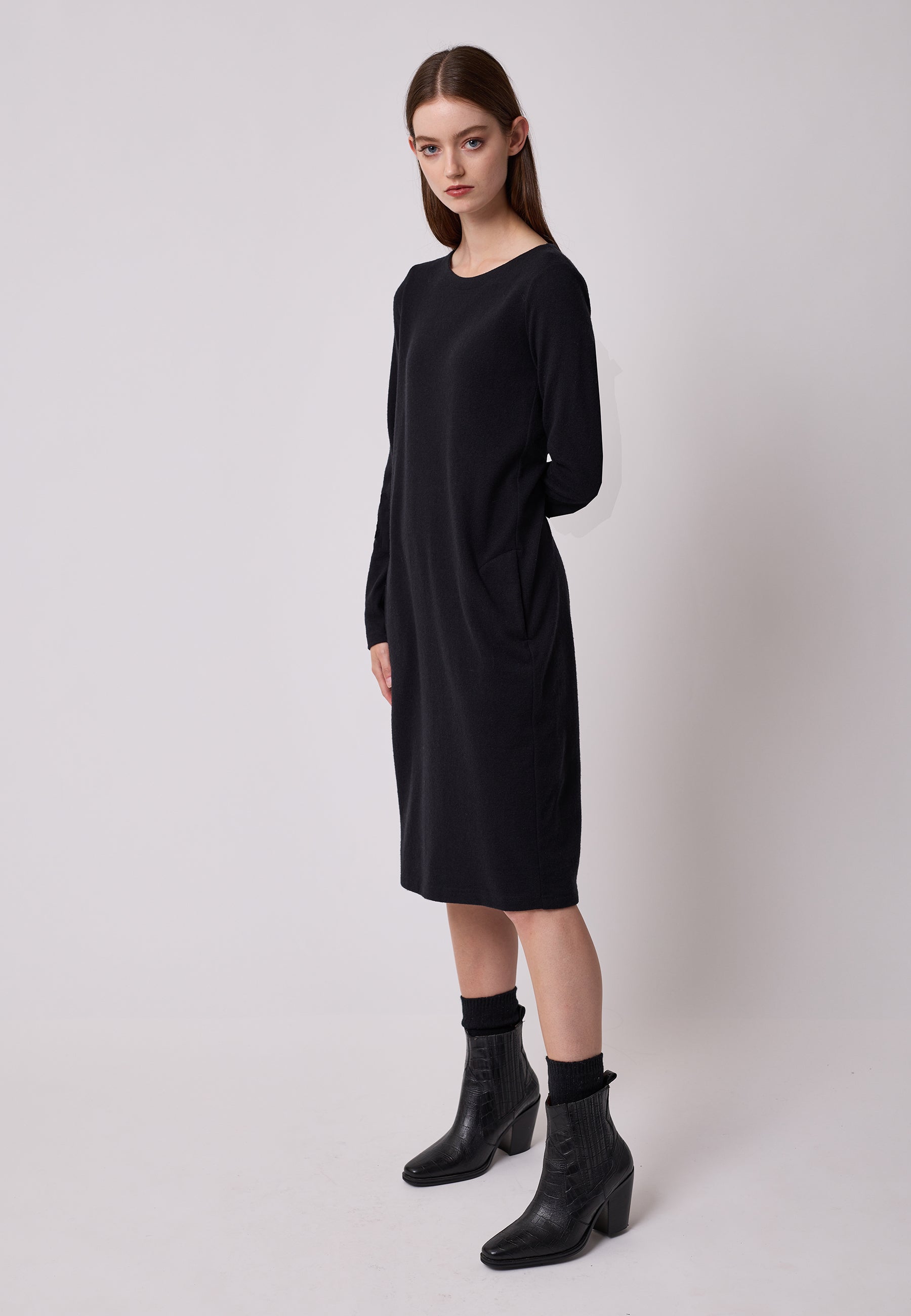 Mara is a timelessly cut dress with a slight A-line silhouette. The forward-facing side seams conceal practical pockets and create a visually slimming silhouette.